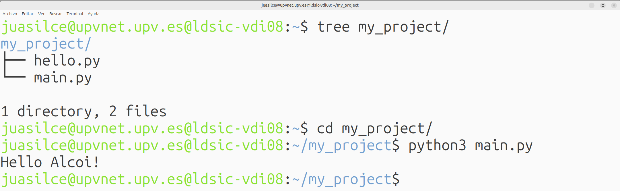 Por ejemplo, dado un proyecto de juguete, consistente en un módulo llamado `hello.py`:
