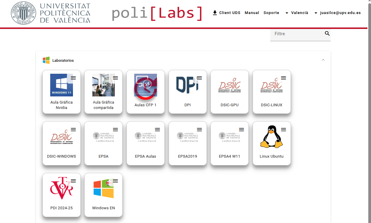 * **Deberás** [**instalar el Cliente UDS**](https://polilabs.upv.es/uds/page/client-download) (tienes el [enlace](https://polilabs.upv.es/uds/page/client-download) para su descarga en el menú horizontal).