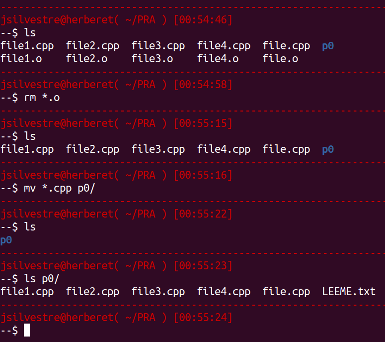 * `mv *.cpp p0/` -> mueve todos los ficheros que acaban en `.cpp` al directorio `src`.