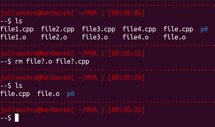 * `rm file[1-3].o` -> elimina todos ficheros empiezan por `file`, seguidos de algun carácter comprendido entre el rango `1-3` (es decir: 1, 2 ó 3), y que acaban en `.o` (p.e. `file1.o`, `file2.o`, `file3.o`).